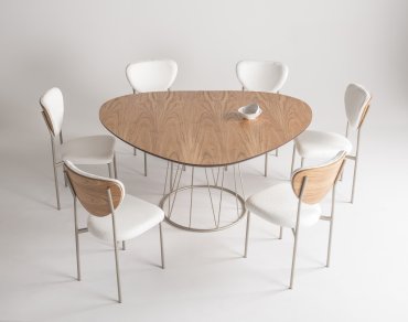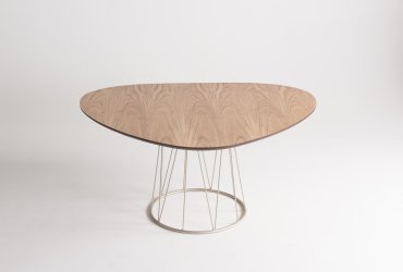Tampo formato orgânico em MDF com acabamento em lâmina madeira cinamomo tingido. Base da mesa em metal com acabamento em pintura epóxi ou metalizado.